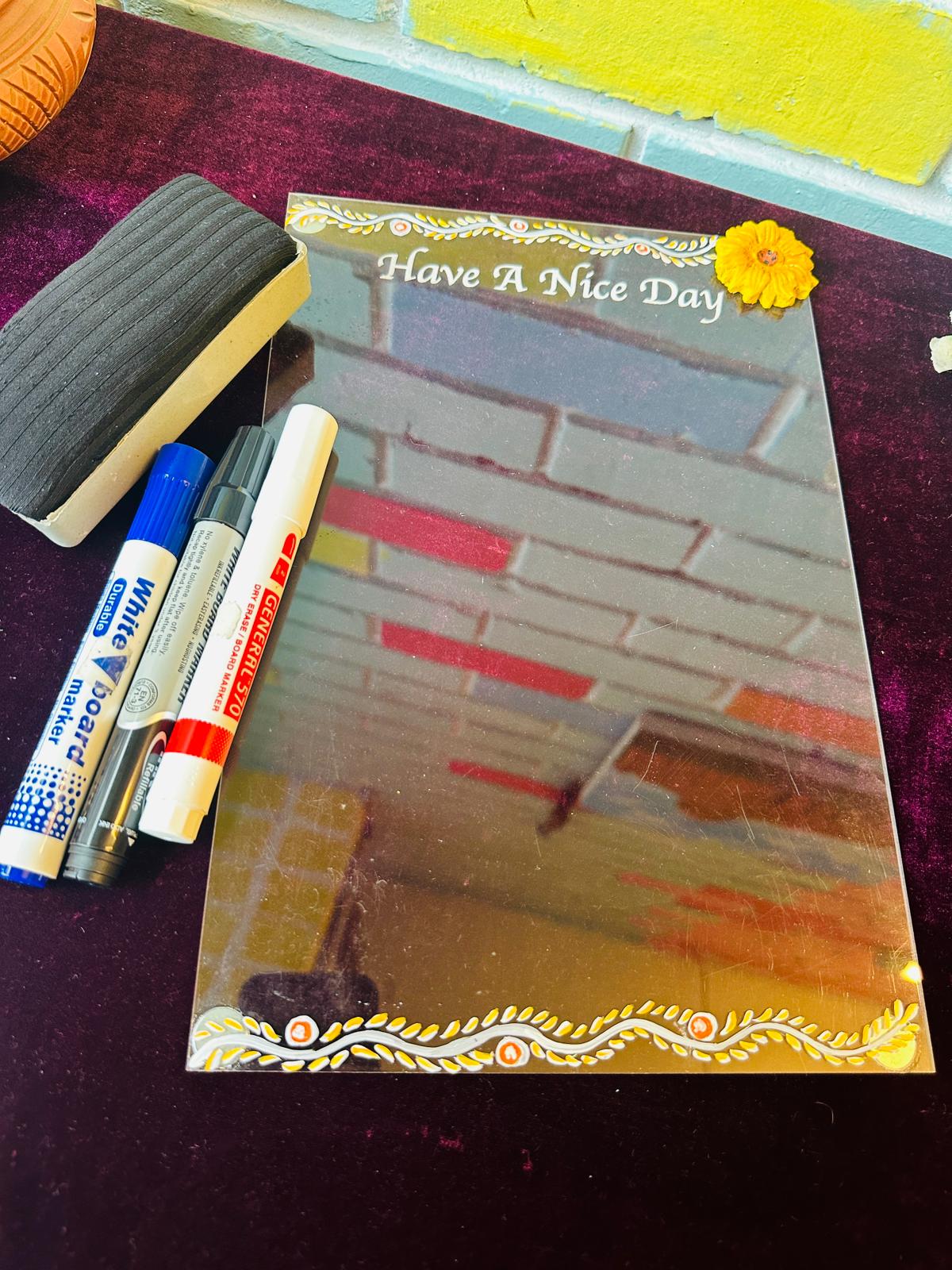 Set Includes | Hand Painted Acrylic Board – 1pc, Magnetic Duster – 1pc, Magnetic Erasable Marker – 3pcs |